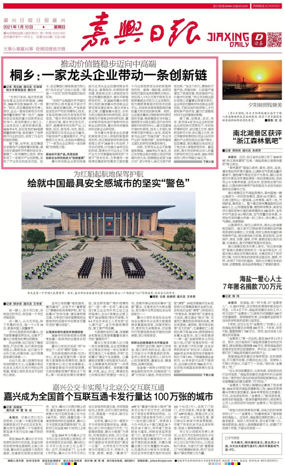 嘉興日報頭版頭條點贊!桐鄉(xiāng):一家龍頭企業(yè)帶動一條創(chuàng)新鏈