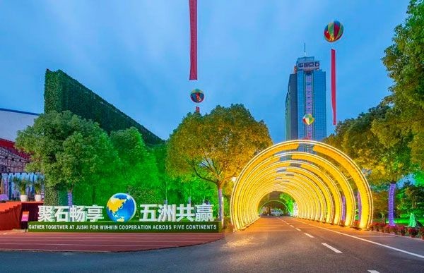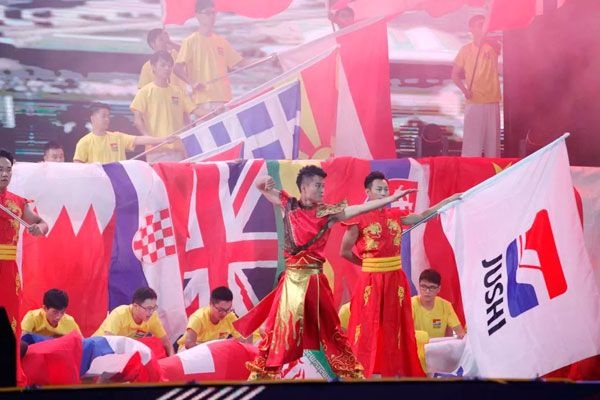 巨石產(chǎn)品遠(yuǎn)銷全球,巨石旗和數(shù)十面國旗在舞臺(tái)上縱情揮舞,五彩飄揚(yáng)的旗幟展現(xiàn)出巨石人勇敢走出去、堅(jiān)定走下去、健康走回來的自信與豪邁。