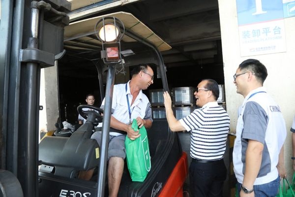 在二、三分廠發(fā)貨平臺,張總仔細觀察倉庫的運作,看到叉車司機井井有條地將貨物裝進集裝箱,張總熱情地和他們打招呼,親切地拍拍他們的肩膀,感謝他們辛苦工作,同時提醒他們注意安全,勞逸結(jié)合,小心中暑。