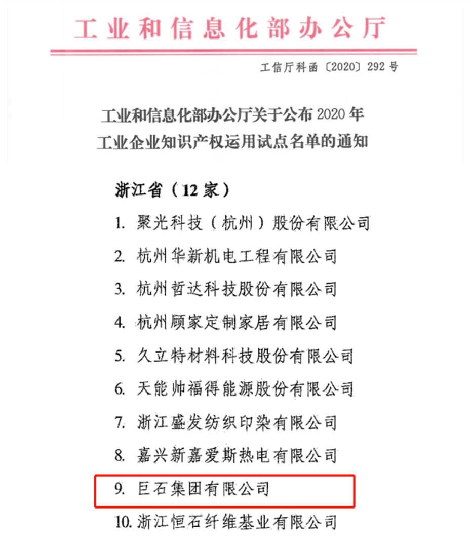 巨石集團榮獲國家工業(yè)企業(yè)知識產(chǎn)權運用試點企業(yè)