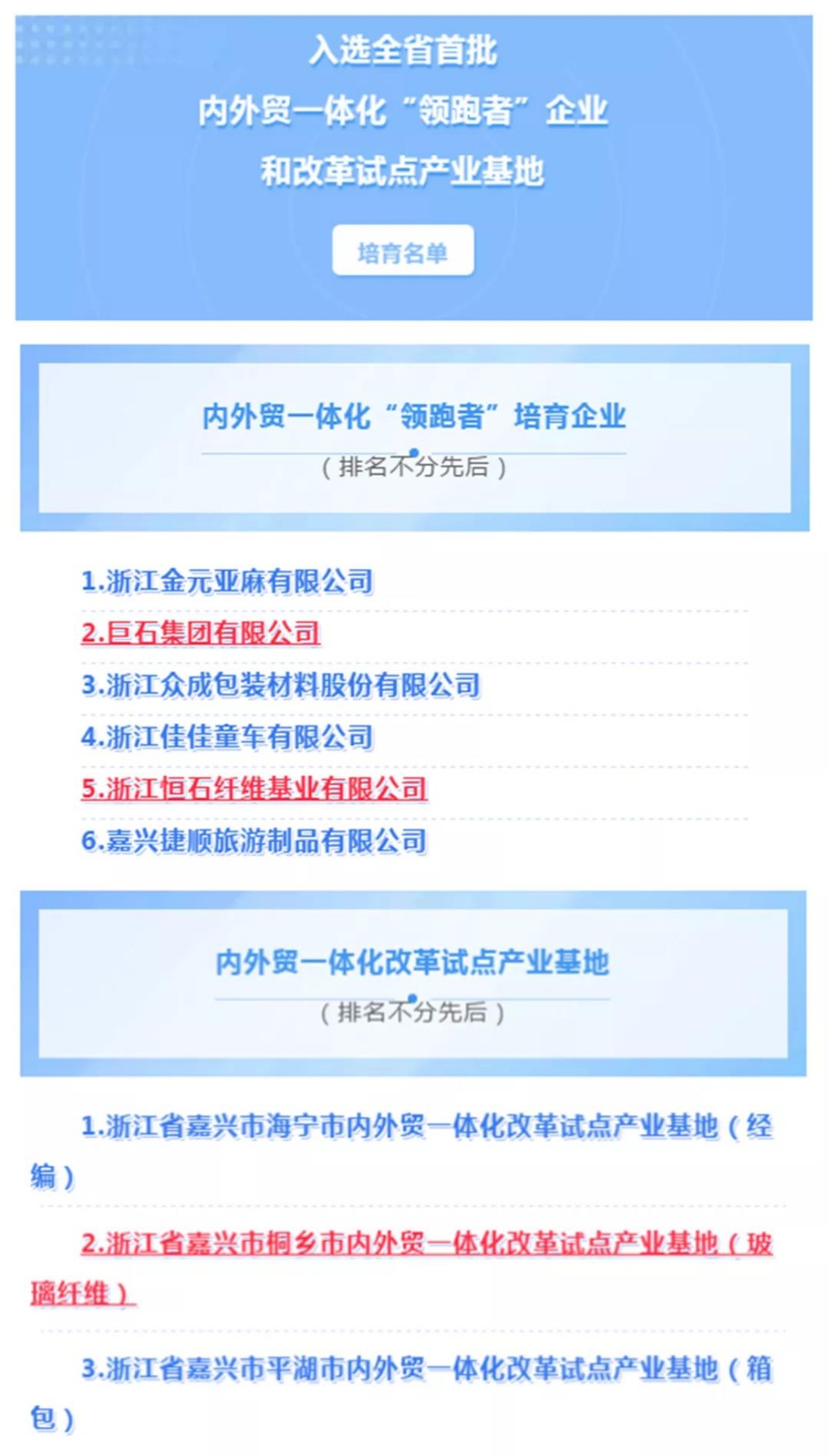 巨石上榜浙江省首批內(nèi)外貿(mào)一體化“領(lǐng)跑者”培育企業(yè)