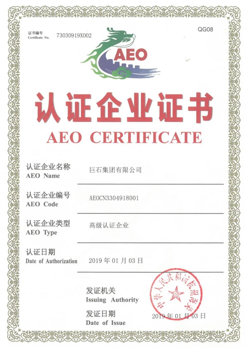 巨石通過(guò)海關(guān)AEO高級(jí)認(rèn)證重新認(rèn)證