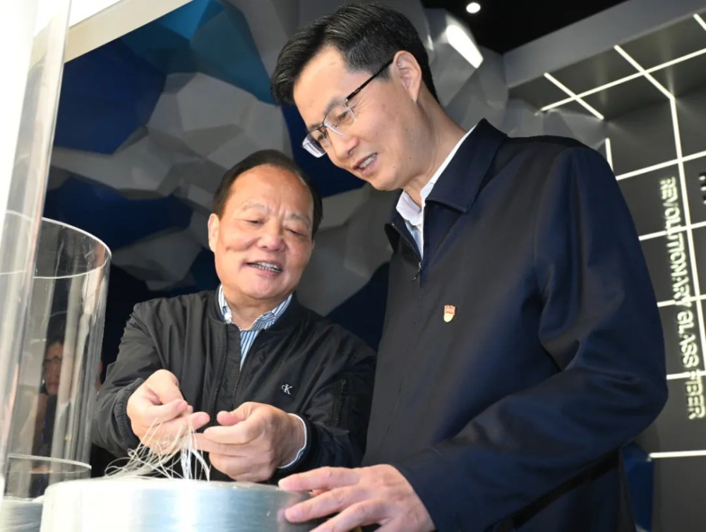 陳偉書記十分關心巨石的研發(fā)投入和生產情況。張毓強總裁詳細匯報了目前巨石的行業(yè)地位、技術研發(fā)及未來工廠建設情況。巨石作為世界玻纖的隱形冠軍,生產的玻璃纖維占世界產能的25%,中國產能的40%。在玻纖生產制造環(huán)節(jié),中國巨石充分利用科研創(chuàng)新,積累沉淀關鍵技術,在高性能玻璃配方、超大型池窯、清潔能源利用、綠色低碳生產、智能智慧制造等方面,實現(xiàn)了100%的自主知識產權,并率先基本實現(xiàn)國產化,解決了卡脖子技術難題。中國巨石除布局浙江桐鄉(xiāng)、江西九江、四川成都三大生產基地之外,還先后在埃及、美國建廠,實現(xiàn)了我國玻纖全套生產技術的海外輸出。隨著中國巨石桐鄉(xiāng)總部新材料智能制造基地的落成,公司已實現(xiàn)“熱固粗紗全球第一、熱塑短切全球第一、電子薄布全球第一”的“三個第一”宏偉目標。桐鄉(xiāng)總部智能制造基地也成為了浙江省首批未來工廠,各項生產指標始終保持世界前列。
