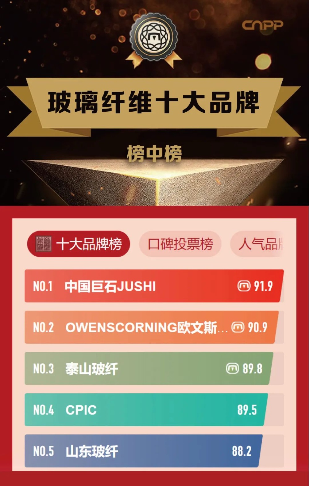 點贊!中國巨石榮登2023年玻璃纖維十大品牌榜單之首
