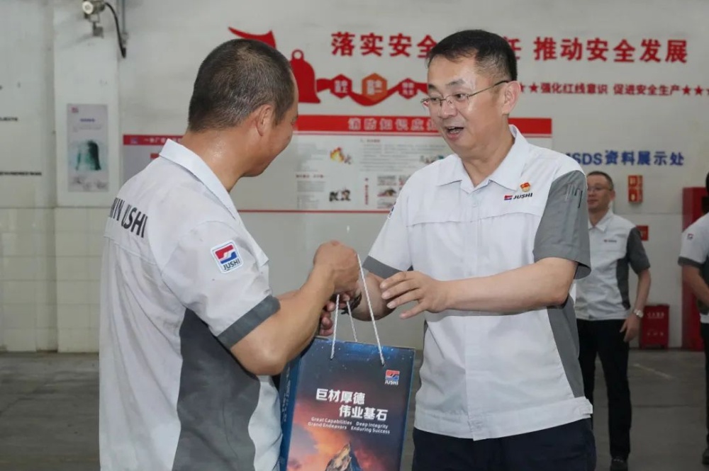 在一分廠,楊國明總裁微笑著和堅守高溫崗位的員工們握手,送上了防暑用品,對他們表示衷心的感謝。一份份“補給包”代表了公司心系員工的心意,也代表著公司多年來實踐員工關愛行動的社會責任。
