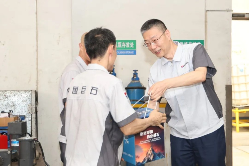 一分廠因為化工原料生產(chǎn)的特殊性,還存在部分高溫作業(yè)崗位,而暑氣籠罩之下員工們依舊堅守生產(chǎn)崗位。楊國明總裁反復叮囑務必勞逸結(jié)合,保障自身健康與工作安全,在堅守崗位的同時照顧好自己。
