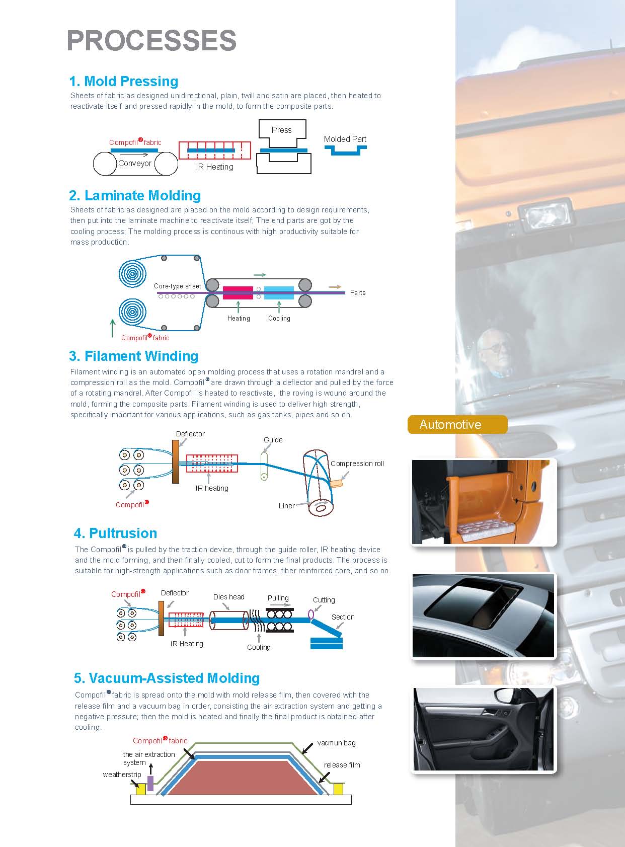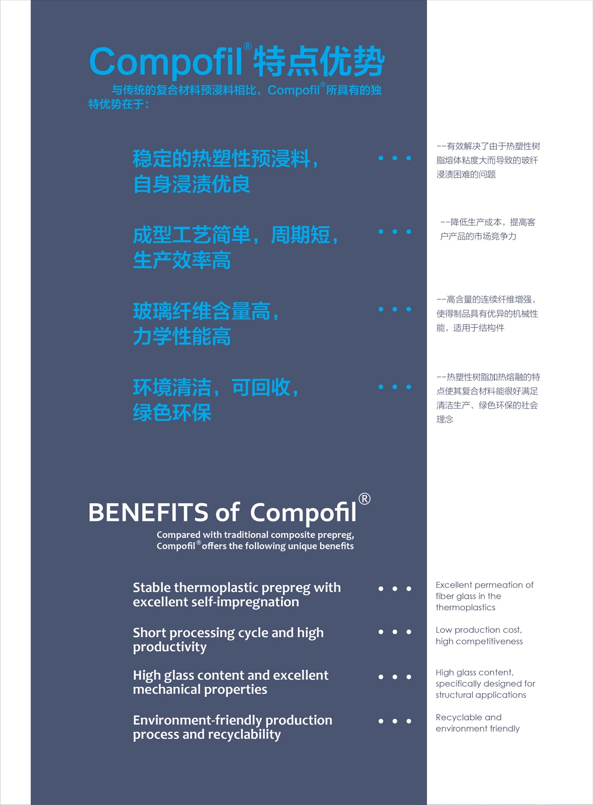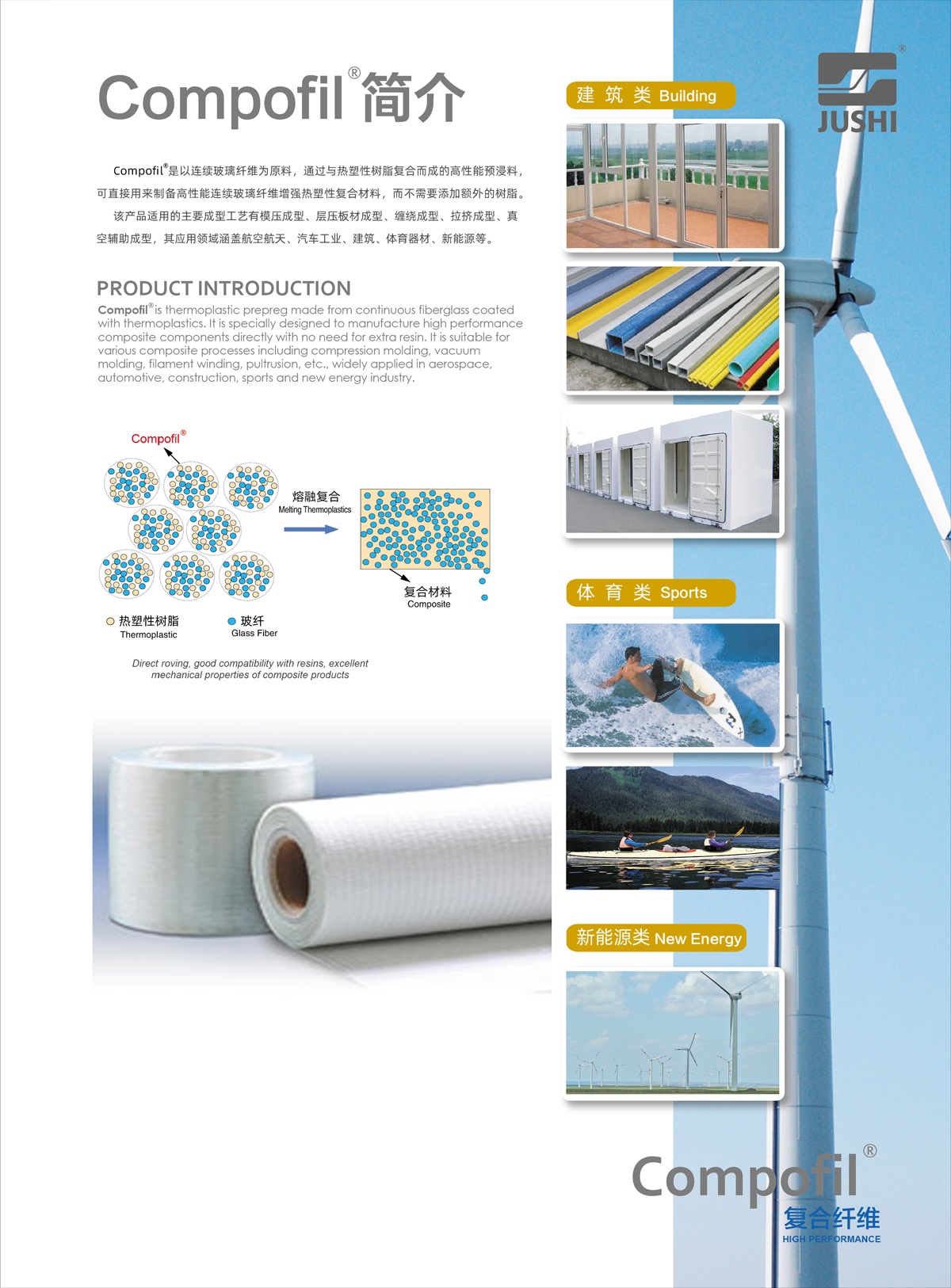 Compofil?是以連續(xù)玻璃纖維為原料,通過與熱塑性樹脂復(fù)合而成的高性能預(yù)浸料,可直接用來制備高性能連續(xù)玻璃纖維增強(qiáng)熱塑性復(fù)合材料,而不需要添加額外的樹脂。