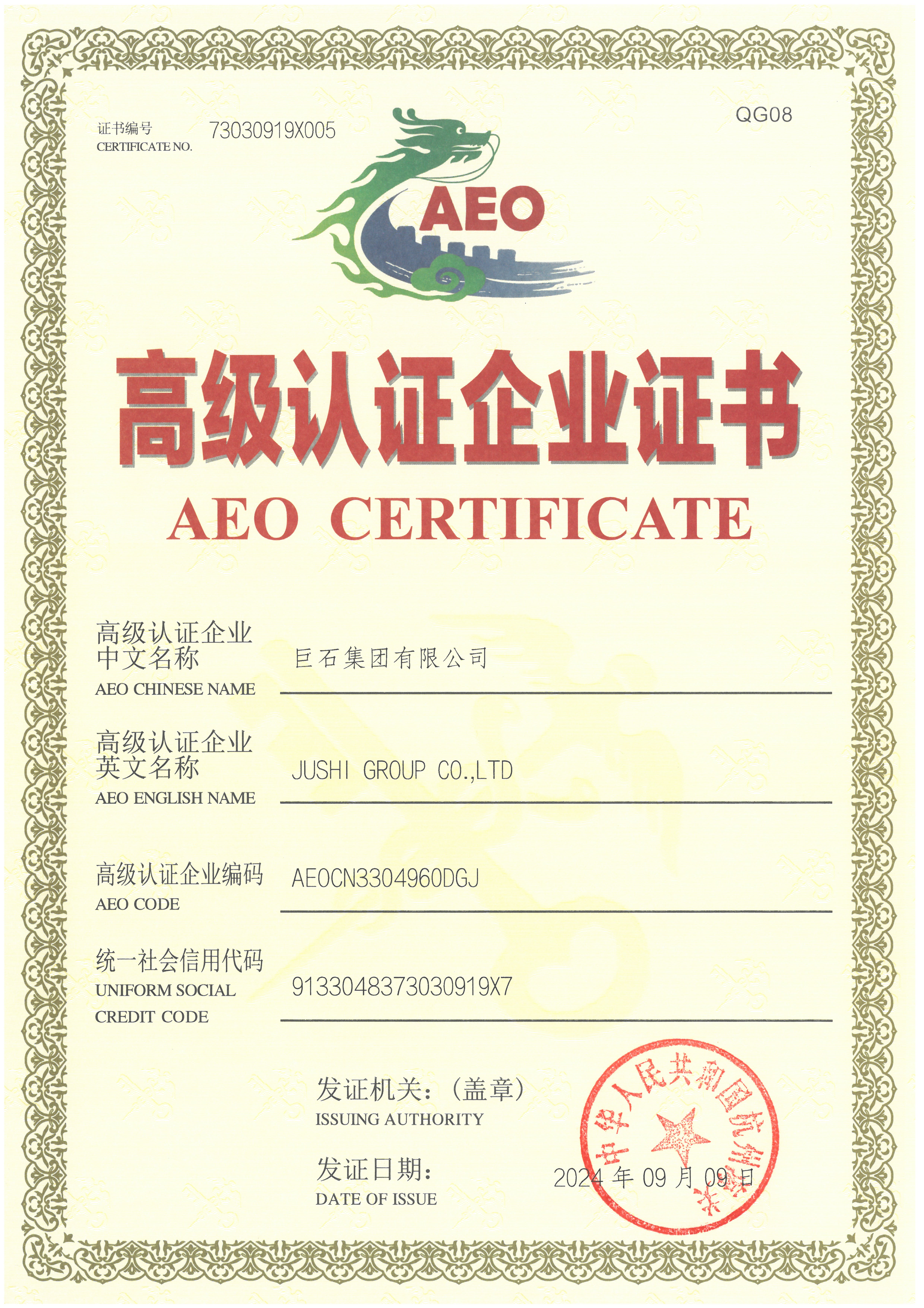 海關(guān)AEO高級(jí)認(rèn)證企業(yè)證書 | |